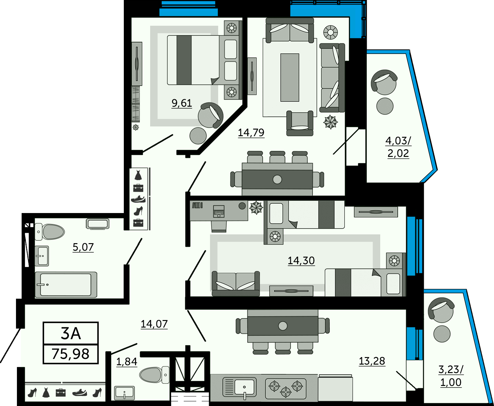 Комфортабельные квартиры с панорамным остеклением. Хорошая площадь всех квартир: до 76 кв. м. Есть лоты с балконом и лоджией, кухней-гостиной, гардеробной и гостевым санузлом.